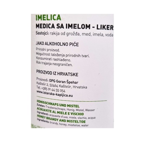 The base for Imelica is a top-quality grape schnapps that is created by strictly controlled fermentation of the highest quality fruits of the wine, with the action of specially selected fruit yeasts, and then carefully distilled. The grape schnapps is refined with mistletoe leaves and the finest acacia honey.