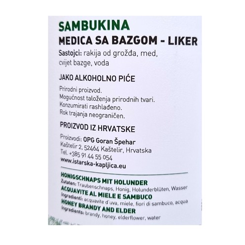 Kao zaljubljenik u Istru i njene okuse i mirise OPG Goran Špehar proizvodi rakije vrhunske kvalitete uz dodatak isključivo prirodnih sastojaka. Sambukina je spoj vrhunske rakije lozovače nastale strogo kontroliranom fermentacijom i zatim destilacijom od najkvalitetnijih plodova vinove loze, sa najfinijem medom od bagrema uz dodatak svježe ubranog cvijeta bazge.